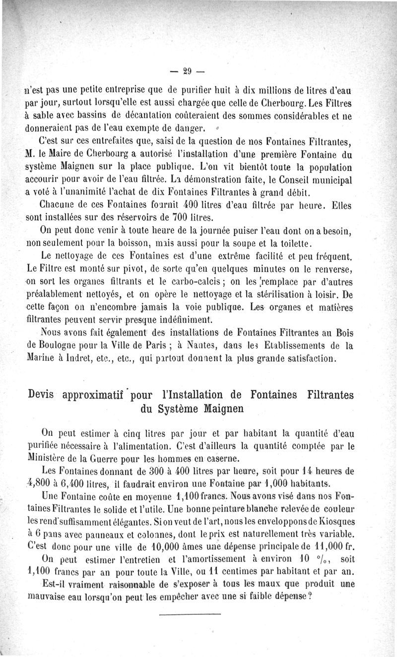 L'Eau purifiée par le filtrage, la question des filtres, le filtre Maignen, les autres filtres, expériences bactériologiques, pollution de l'eau dans les conduites