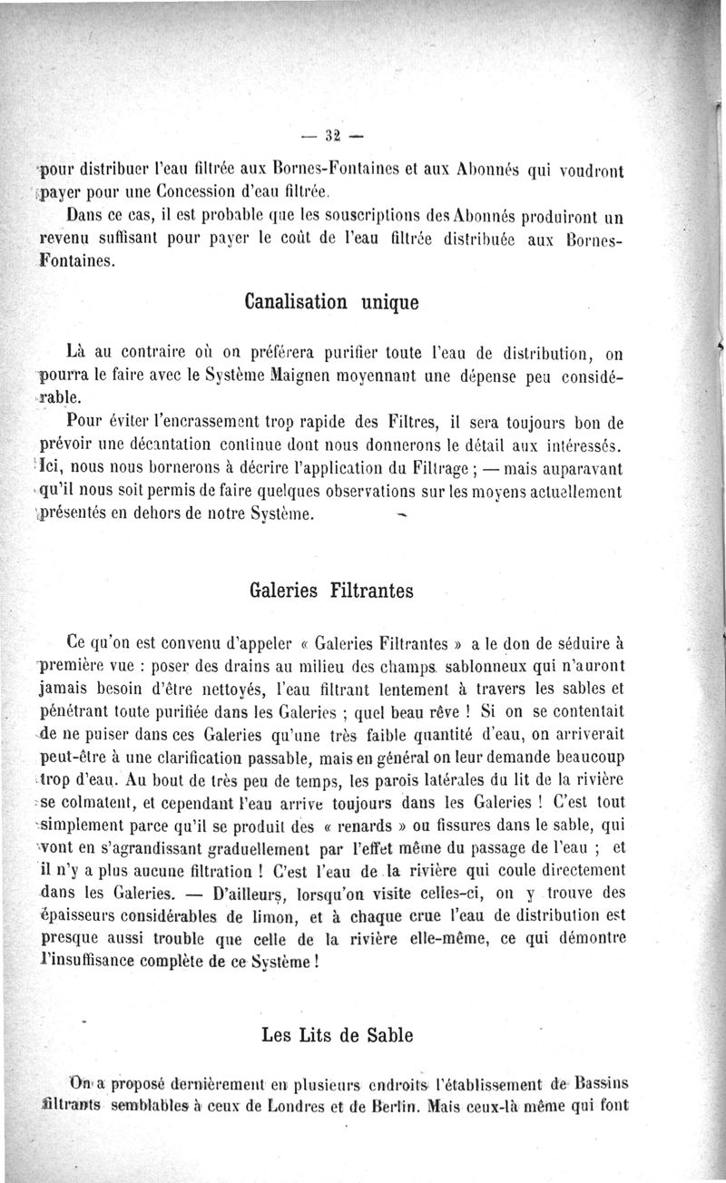 L'Eau purifiée par le filtrage, la question des filtres, le filtre Maignen, les autres filtres, expériences bactériologiques, pollution de l'eau dans les conduites