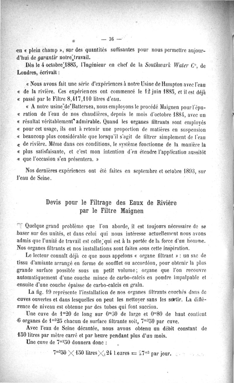 L'Eau purifiée par le filtrage, la question des filtres, le filtre Maignen, les autres filtres, expériences bactériologiques, pollution de l'eau dans les conduites