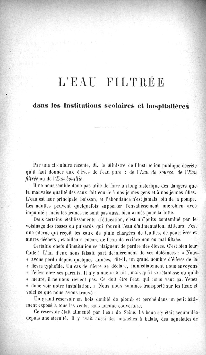 L'Eau purifiée par le filtrage, la question des filtres, le filtre Maignen, les autres filtres, expériences bactériologiques, pollution de l'eau dans les conduites