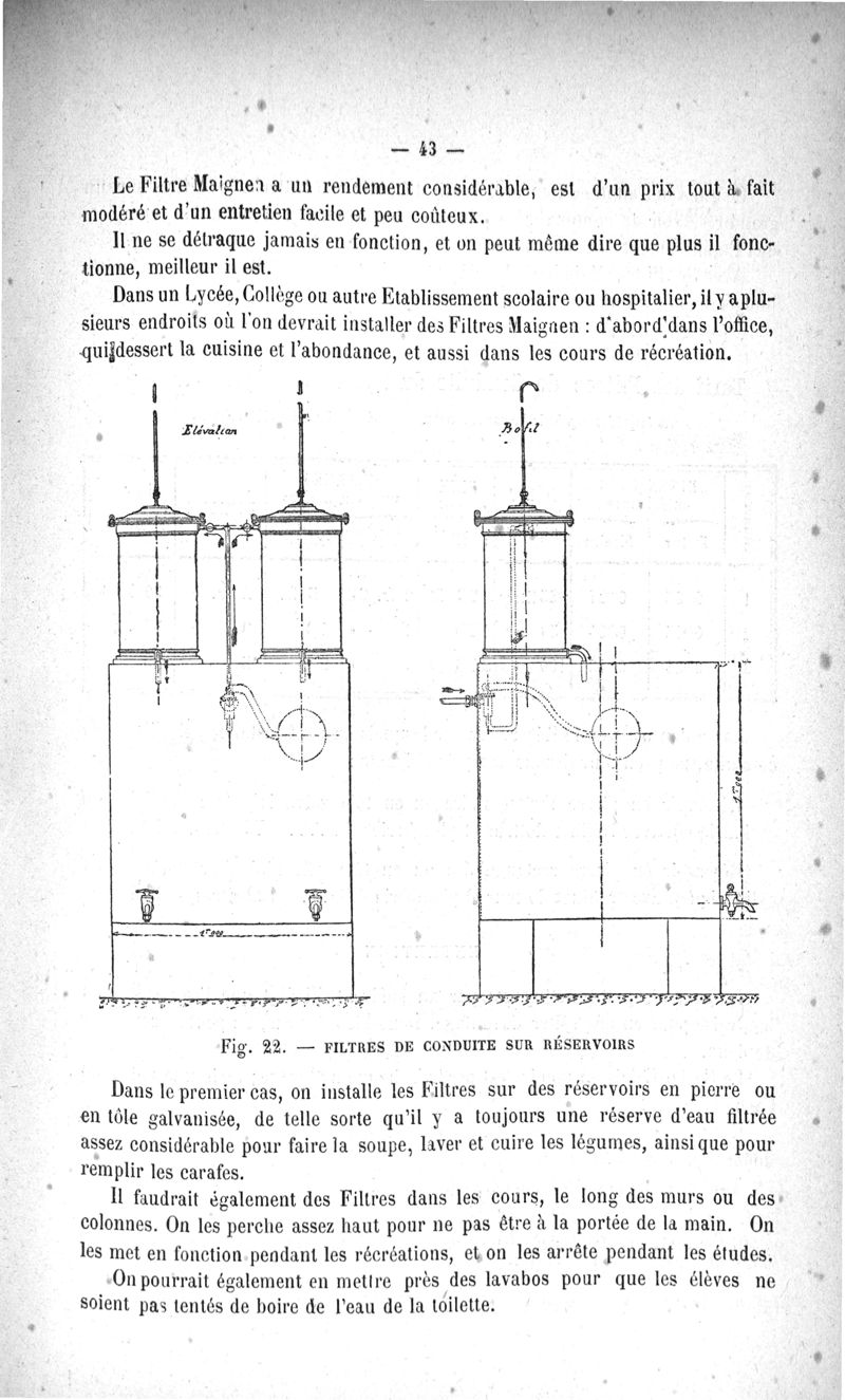 L'Eau purifiée par le filtrage, la question des filtres, le filtre Maignen, les autres filtres, expériences bactériologiques, pollution de l'eau dans les conduites