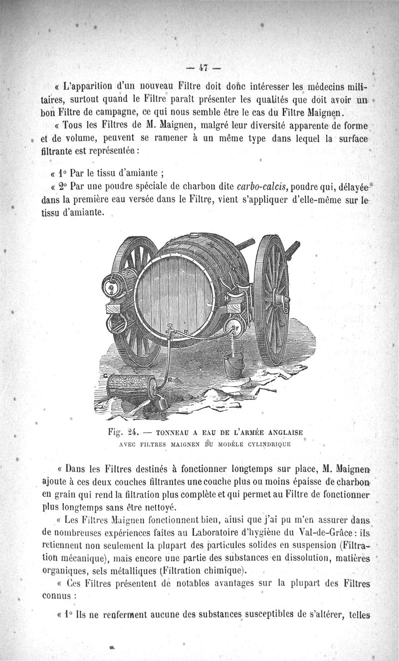 L'Eau purifiée par le filtrage, la question des filtres, le filtre Maignen, les autres filtres, expériences bactériologiques, pollution de l'eau dans les conduites
