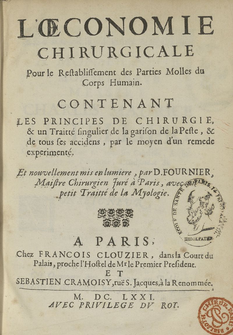 L'Oeconomie chirurgicale, pour le restablissement des parties molles du corps humain. Contenant les principes de chirurgie, & un Traitté methodique de la garison de la peste, & de tous ses accidents, par le moyen d'un remede experimenté. Et nouvellement mis en lumiere...
