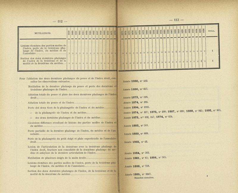 Recherches sur les maladies simulées et mutilations volontaires observées de 1859 à 1896 : chez les jeunes gens, conscrits ou militaires en activité de service envoyées à la 2e compagnie de pionniers jusqu'en 1875 et, depuis cette époque, à la 4e compagnie de discipline