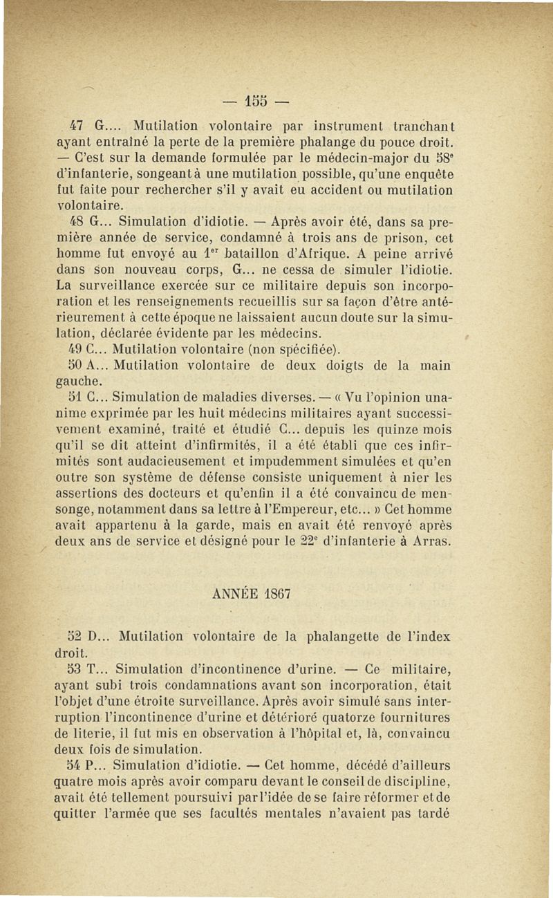 Recherches sur les maladies simulées et mutilations volontaires observées de 1859 à 1896 : chez les jeunes gens, conscrits ou militaires en activité de service envoyées à la 2e compagnie de pionniers jusqu'en 1875 et, depuis cette époque, à la 4e compagnie de discipline