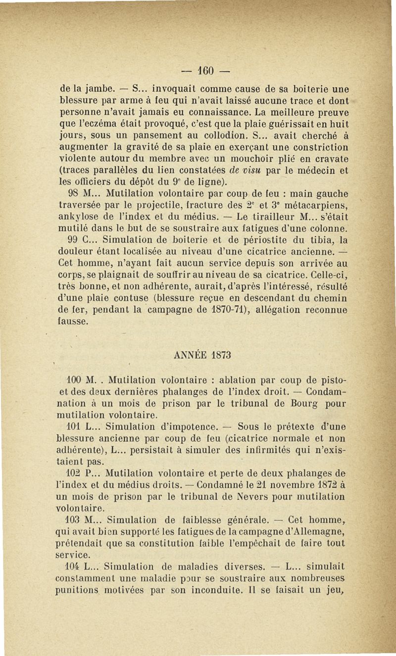 Recherches sur les maladies simulées et mutilations volontaires observées de 1859 à 1896 : chez les jeunes gens, conscrits ou militaires en activité de service envoyées à la 2e compagnie de pionniers jusqu'en 1875 et, depuis cette époque, à la 4e compagnie de discipline