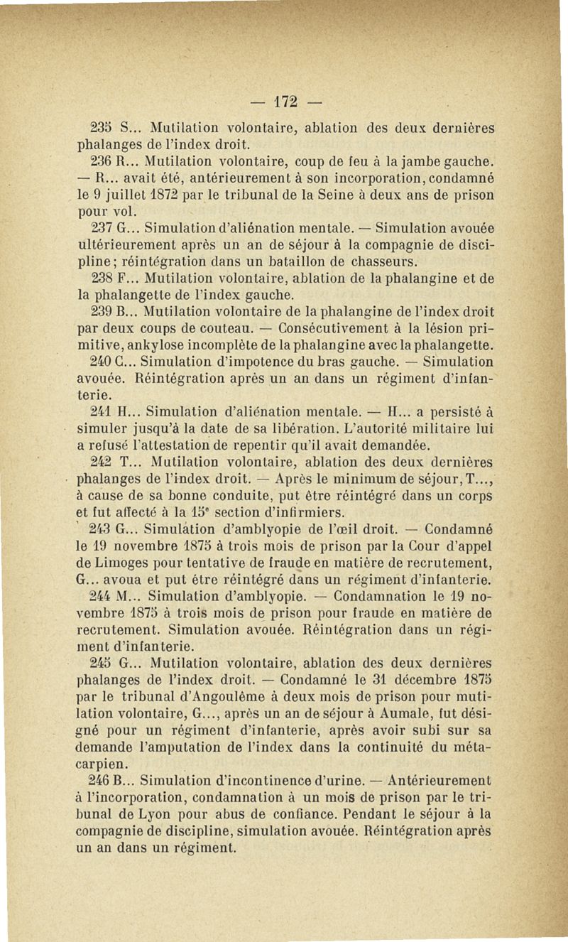 Recherches sur les maladies simulées et mutilations volontaires observées de 1859 à 1896 : chez les jeunes gens, conscrits ou militaires en activité de service envoyées à la 2e compagnie de pionniers jusqu'en 1875 et, depuis cette époque, à la 4e compagnie de discipline