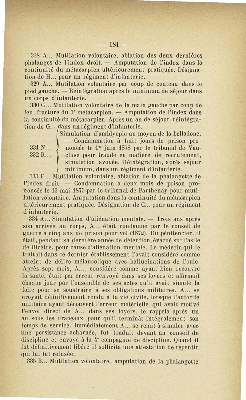 Recherches sur les maladies simulées et mutilations volontaires observées de 1859 à 1896 : chez les jeunes gens, conscrits ou militaires en activité de service envoyées à la 2e compagnie de pionniers jusqu'en 1875 et, depuis cette époque, à la 4e compagnie de discipline