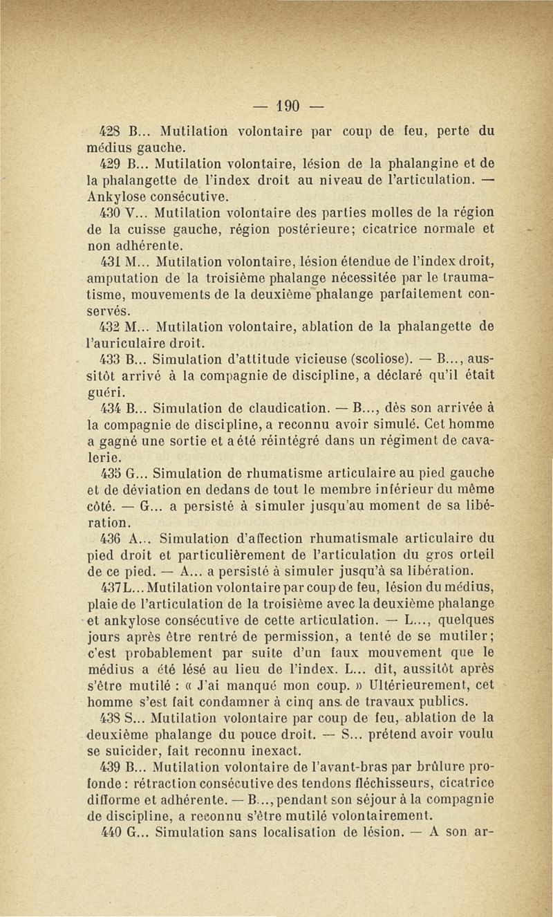 Recherches sur les maladies simulées et mutilations volontaires observées de 1859 à 1896 : chez les jeunes gens, conscrits ou militaires en activité de service envoyées à la 2e compagnie de pionniers jusqu'en 1875 et, depuis cette époque, à la 4e compagnie de discipline