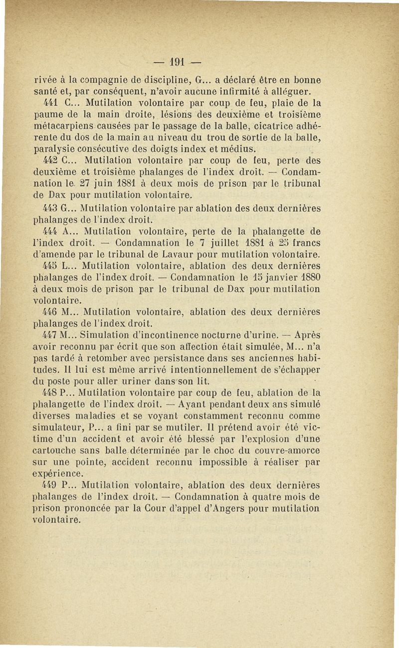 Recherches sur les maladies simulées et mutilations volontaires observées de 1859 à 1896 : chez les jeunes gens, conscrits ou militaires en activité de service envoyées à la 2e compagnie de pionniers jusqu'en 1875 et, depuis cette époque, à la 4e compagnie de discipline