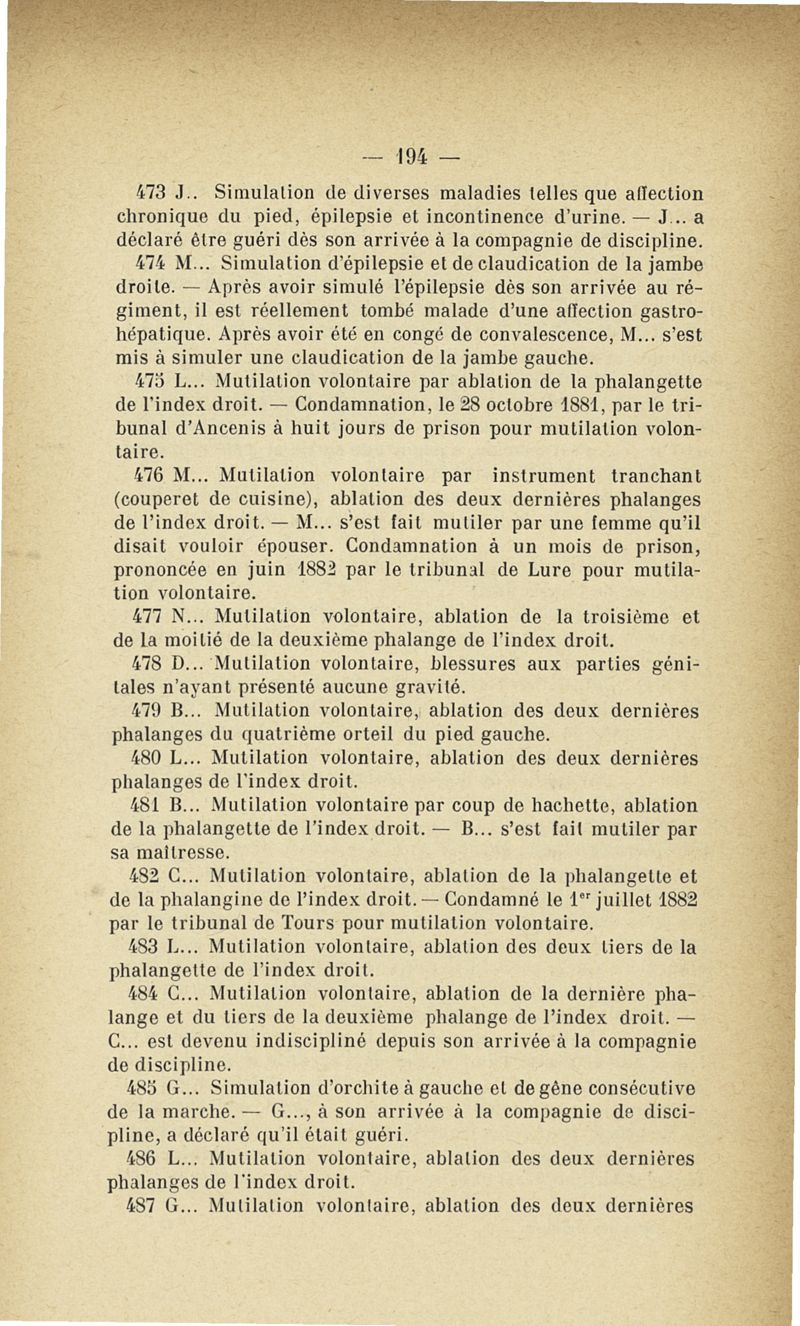 Recherches sur les maladies simulées et mutilations volontaires observées de 1859 à 1896 : chez les jeunes gens, conscrits ou militaires en activité de service envoyées à la 2e compagnie de pionniers jusqu'en 1875 et, depuis cette époque, à la 4e compagnie de discipline