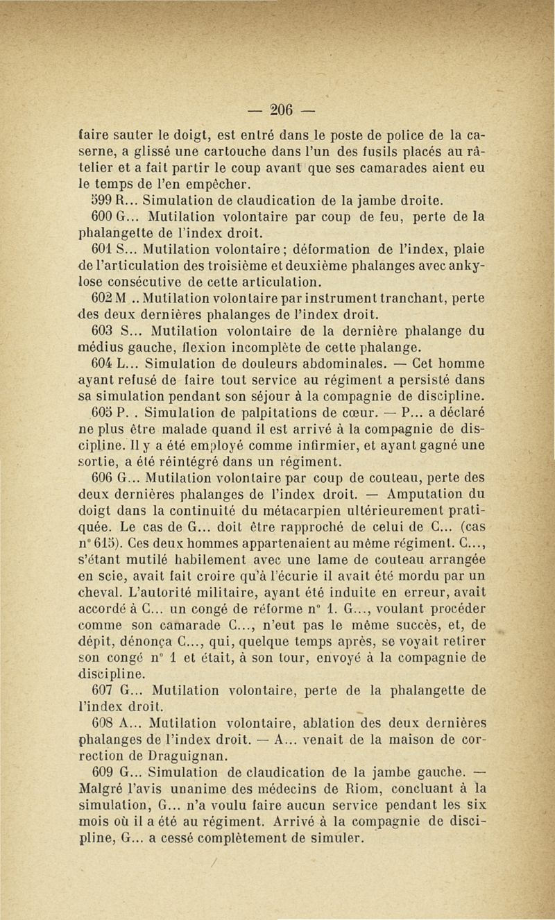 Recherches sur les maladies simulées et mutilations volontaires observées de 1859 à 1896 : chez les jeunes gens, conscrits ou militaires en activité de service envoyées à la 2e compagnie de pionniers jusqu'en 1875 et, depuis cette époque, à la 4e compagnie de discipline