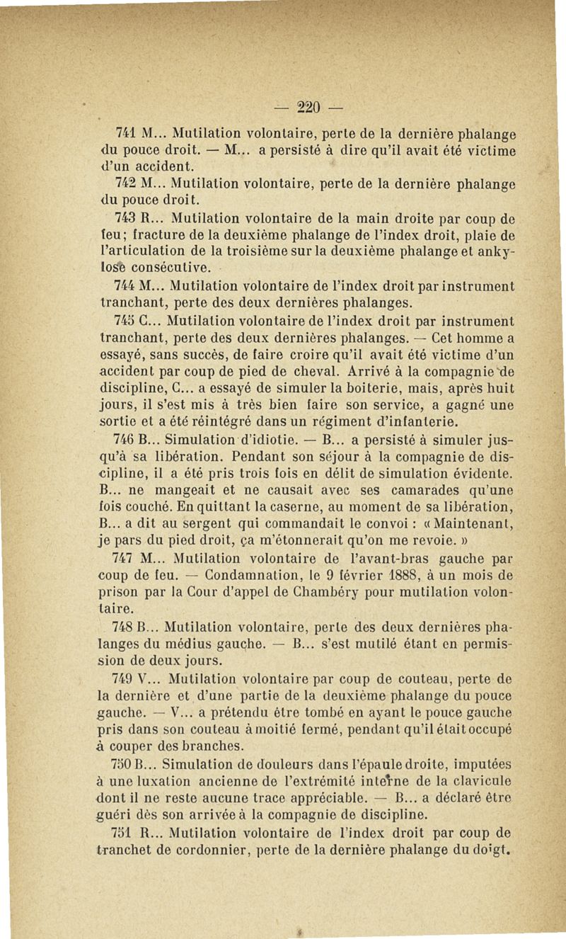 Recherches sur les maladies simulées et mutilations volontaires observées de 1859 à 1896 : chez les jeunes gens, conscrits ou militaires en activité de service envoyées à la 2e compagnie de pionniers jusqu'en 1875 et, depuis cette époque, à la 4e compagnie de discipline