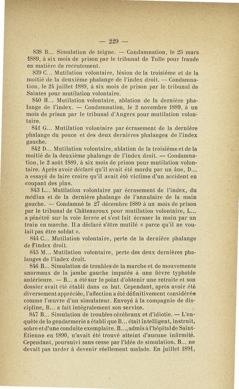 Recherches sur les maladies simulées et mutilations volontaires observées de 1859 à 1896 : chez les jeunes gens, conscrits ou militaires en activité de service envoyées à la 2e compagnie de pionniers jusqu'en 1875 et, depuis cette époque, à la 4e compagnie de discipline