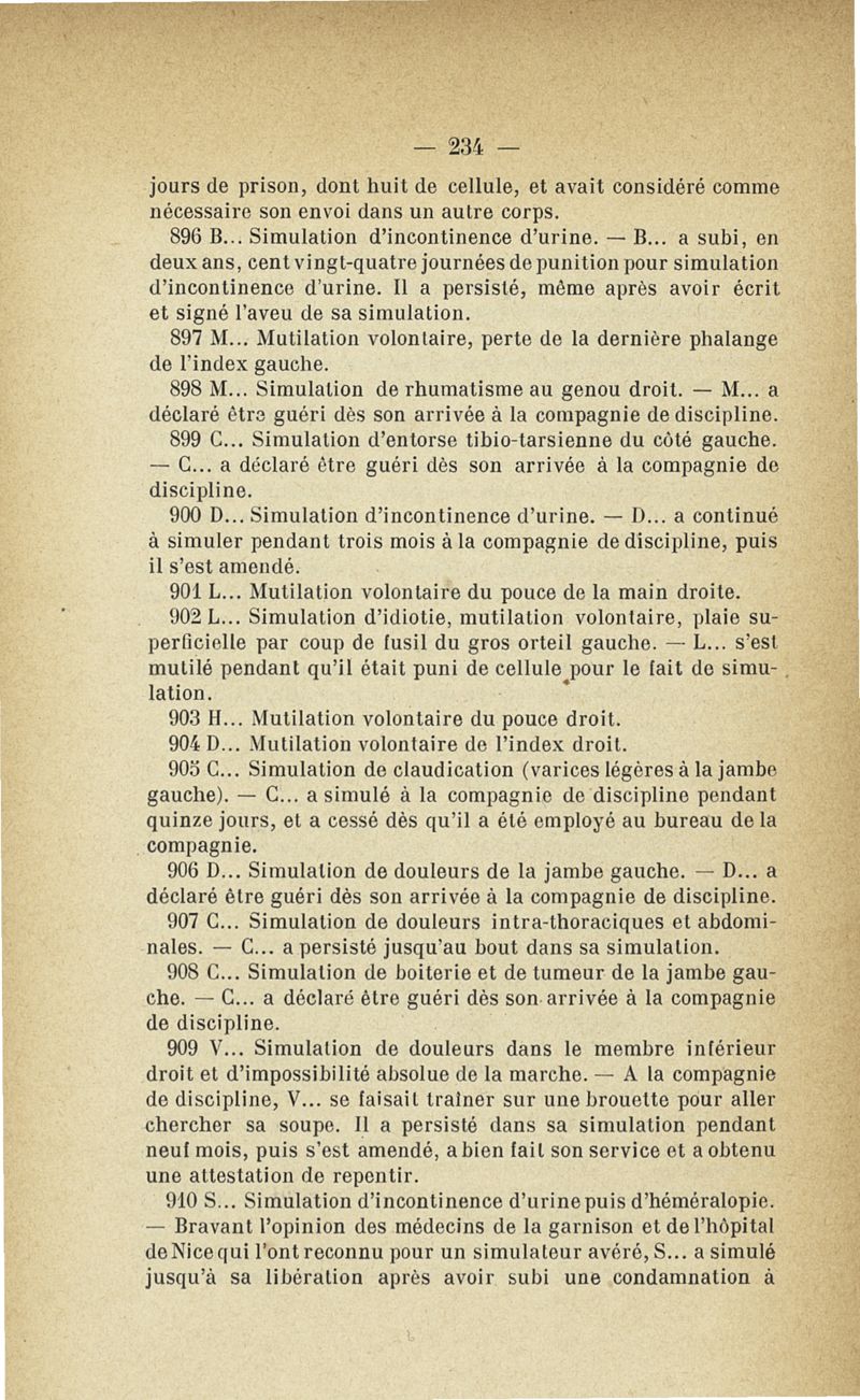 Recherches sur les maladies simulées et mutilations volontaires observées de 1859 à 1896 : chez les jeunes gens, conscrits ou militaires en activité de service envoyées à la 2e compagnie de pionniers jusqu'en 1875 et, depuis cette époque, à la 4e compagnie de discipline