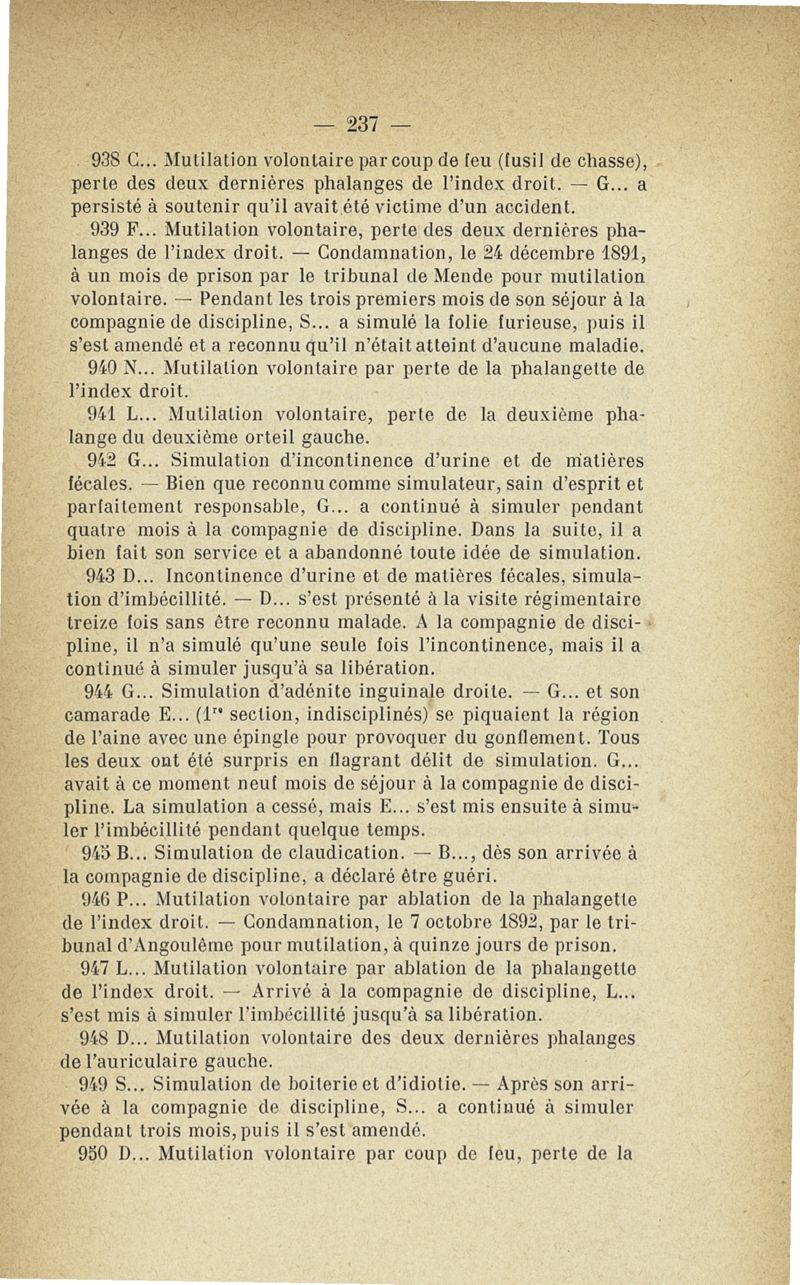 Recherches sur les maladies simulées et mutilations volontaires observées de 1859 à 1896 : chez les jeunes gens, conscrits ou militaires en activité de service envoyées à la 2e compagnie de pionniers jusqu'en 1875 et, depuis cette époque, à la 4e compagnie de discipline