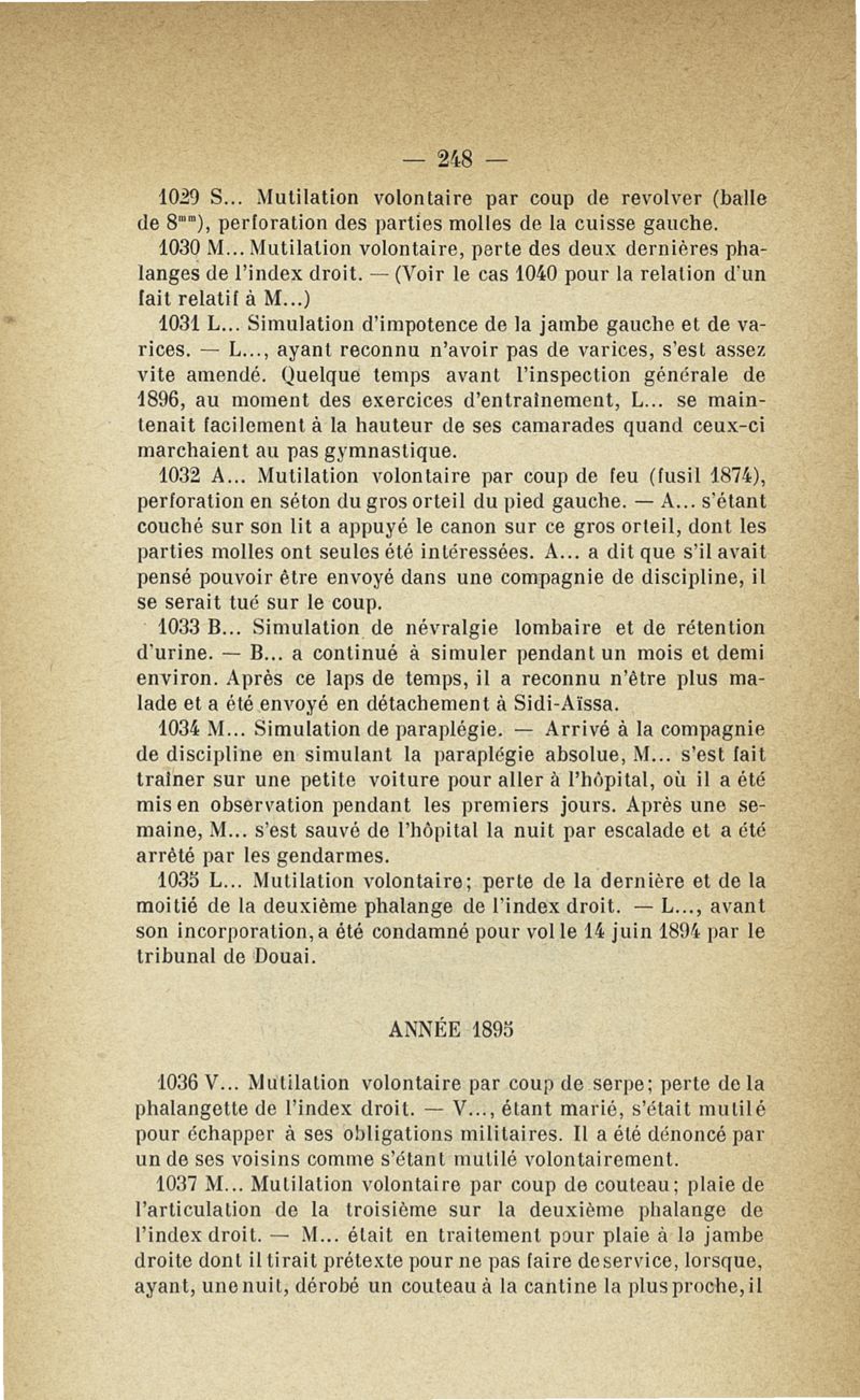 Recherches sur les maladies simulées et mutilations volontaires observées de 1859 à 1896 : chez les jeunes gens, conscrits ou militaires en activité de service envoyées à la 2e compagnie de pionniers jusqu'en 1875 et, depuis cette époque, à la 4e compagnie de discipline