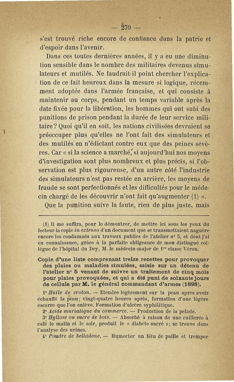 Recherches sur les maladies simulées et mutilations volontaires observées de 1859 à 1896 : chez les jeunes gens, conscrits ou militaires en activité de service envoyées à la 2e compagnie de pionniers jusqu'en 1875 et, depuis cette époque, à la 4e compagnie de discipline