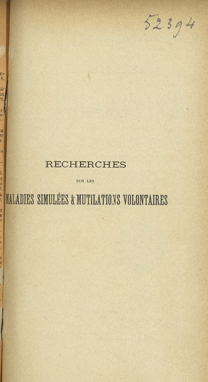 Recherches sur les maladies simulées et mutilations volontaires observées de 1859 à 1896 : chez les jeunes gens, conscrits ou militaires en activité de service envoyées à la 2e compagnie de pionniers jusqu'en 1875 et, depuis cette époque, à la 4e compagnie de discipline