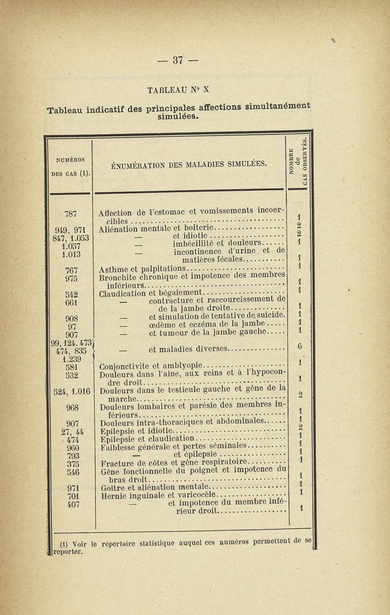 Recherches sur les maladies simulées et mutilations volontaires observées de 1859 à 1896 : chez les jeunes gens, conscrits ou militaires en activité de service envoyées à la 2e compagnie de pionniers jusqu'en 1875 et, depuis cette époque, à la 4e compagnie de discipline