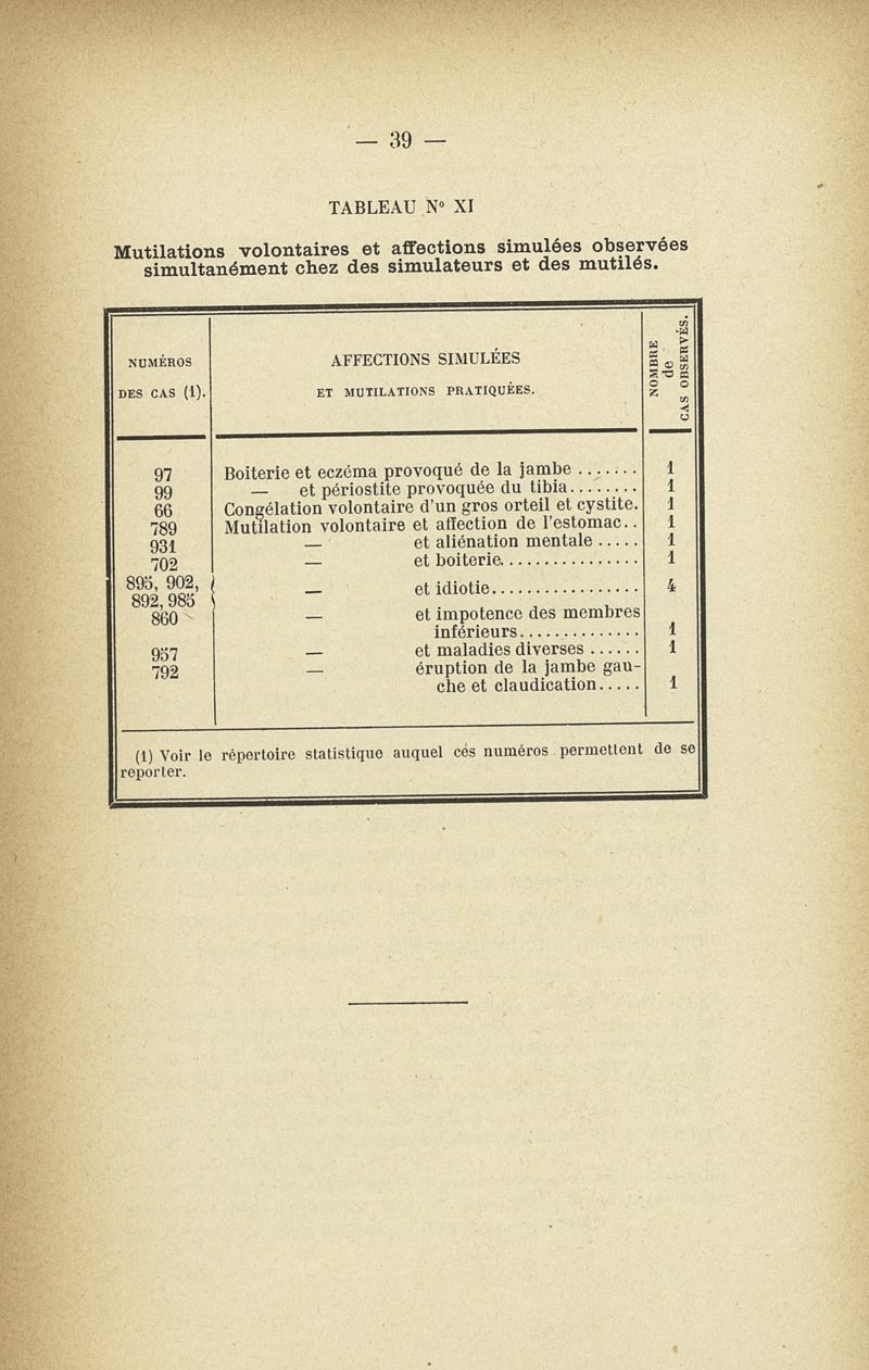 Recherches sur les maladies simulées et mutilations volontaires observées de 1859 à 1896 : chez les jeunes gens, conscrits ou militaires en activité de service envoyées à la 2e compagnie de pionniers jusqu'en 1875 et, depuis cette époque, à la 4e compagnie de discipline