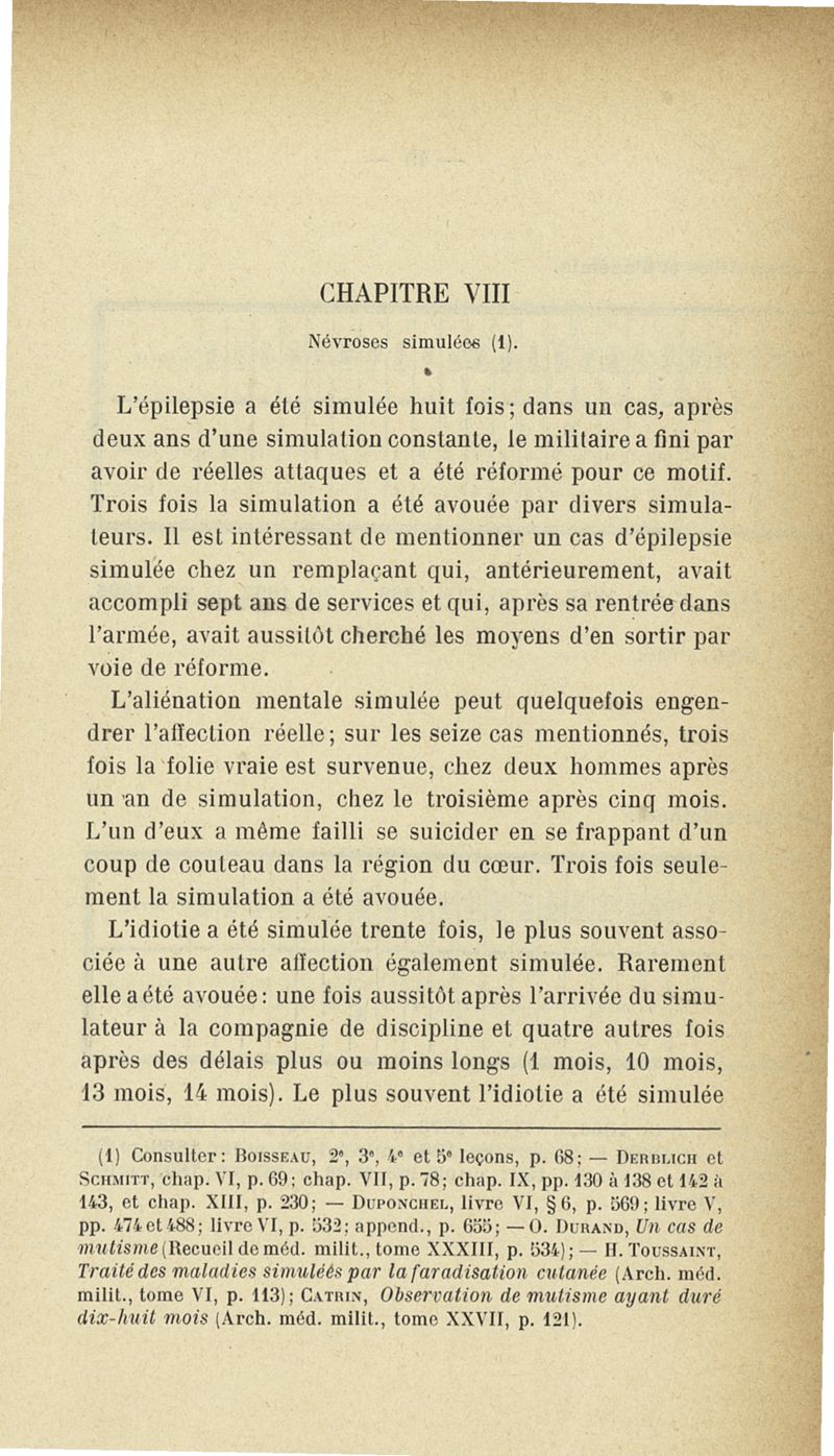 Recherches sur les maladies simulées et mutilations volontaires observées de 1859 à 1896 : chez les jeunes gens, conscrits ou militaires en activité de service envoyées à la 2e compagnie de pionniers jusqu'en 1875 et, depuis cette époque, à la 4e compagnie de discipline
