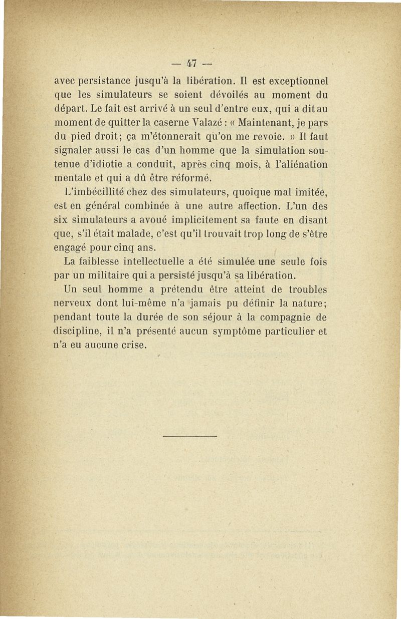 Recherches sur les maladies simulées et mutilations volontaires observées de 1859 à 1896 : chez les jeunes gens, conscrits ou militaires en activité de service envoyées à la 2e compagnie de pionniers jusqu'en 1875 et, depuis cette époque, à la 4e compagnie de discipline