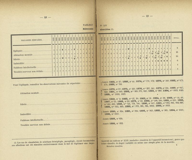 Recherches sur les maladies simulées et mutilations volontaires observées de 1859 à 1896 : chez les jeunes gens, conscrits ou militaires en activité de service envoyées à la 2e compagnie de pionniers jusqu'en 1875 et, depuis cette époque, à la 4e compagnie de discipline