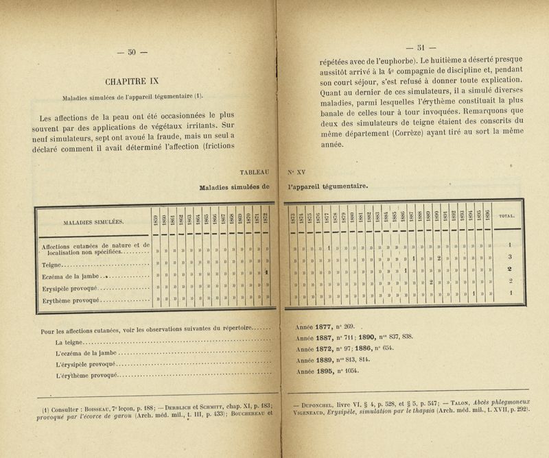 Recherches sur les maladies simulées et mutilations volontaires observées de 1859 à 1896 : chez les jeunes gens, conscrits ou militaires en activité de service envoyées à la 2e compagnie de pionniers jusqu'en 1875 et, depuis cette époque, à la 4e compagnie de discipline