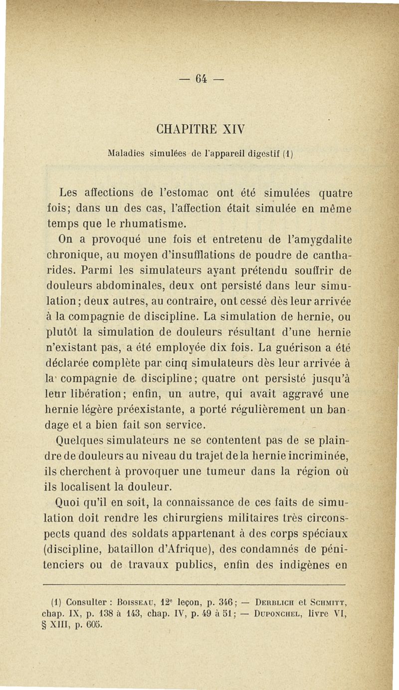 Recherches sur les maladies simulées et mutilations volontaires observées de 1859 à 1896 : chez les jeunes gens, conscrits ou militaires en activité de service envoyées à la 2e compagnie de pionniers jusqu'en 1875 et, depuis cette époque, à la 4e compagnie de discipline