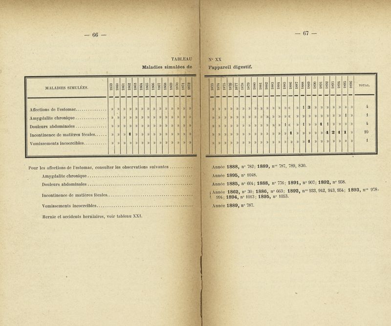 Recherches sur les maladies simulées et mutilations volontaires observées de 1859 à 1896 : chez les jeunes gens, conscrits ou militaires en activité de service envoyées à la 2e compagnie de pionniers jusqu'en 1875 et, depuis cette époque, à la 4e compagnie de discipline