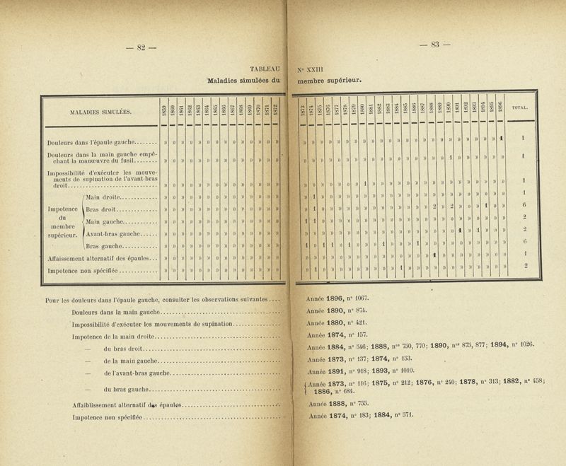 Recherches sur les maladies simulées et mutilations volontaires observées de 1859 à 1896 : chez les jeunes gens, conscrits ou militaires en activité de service envoyées à la 2e compagnie de pionniers jusqu'en 1875 et, depuis cette époque, à la 4e compagnie de discipline