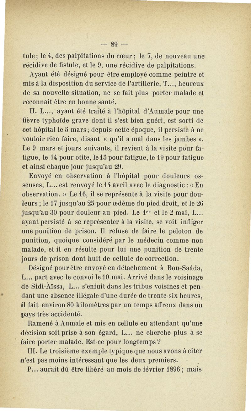Recherches sur les maladies simulées et mutilations volontaires observées de 1859 à 1896 : chez les jeunes gens, conscrits ou militaires en activité de service envoyées à la 2e compagnie de pionniers jusqu'en 1875 et, depuis cette époque, à la 4e compagnie de discipline