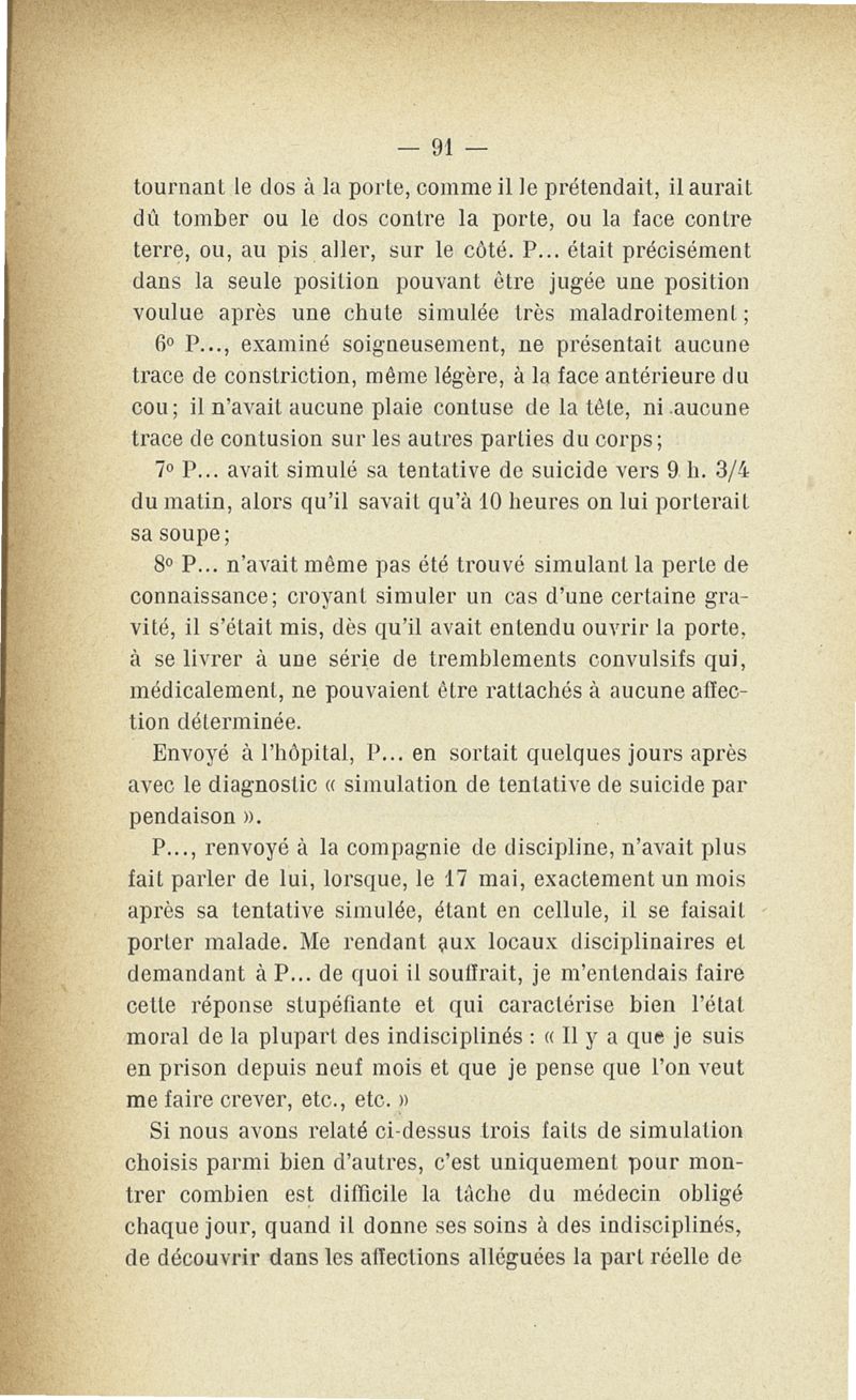 Recherches sur les maladies simulées et mutilations volontaires observées de 1859 à 1896 : chez les jeunes gens, conscrits ou militaires en activité de service envoyées à la 2e compagnie de pionniers jusqu'en 1875 et, depuis cette époque, à la 4e compagnie de discipline