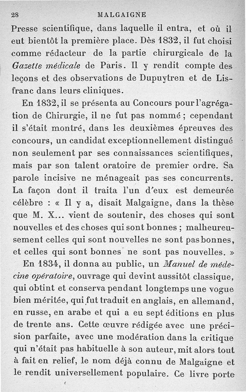 Malgaigne (1806-1865) : étude sur sa vie et ses idées d'après ses écrits, des papiers de famille et des souvenirs particuliers