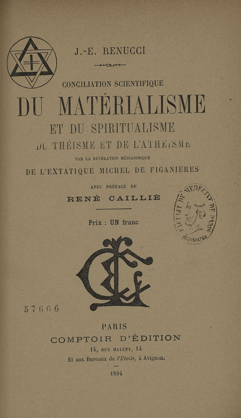 Conciliation scientifique du matérialisme et du spiritualisme, du théisme et de l'athéisme par la révélation médianimique de l'extatique Michel de Figanières, Avec préface de René Caillié