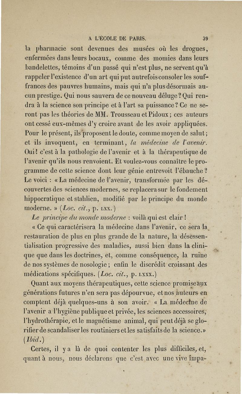 De l'enseignement de la thérapeutique à l'Ecole de Paris: examen du Traité de thérapeutique et de matière médicale de MM. Trousseau et Pidoux