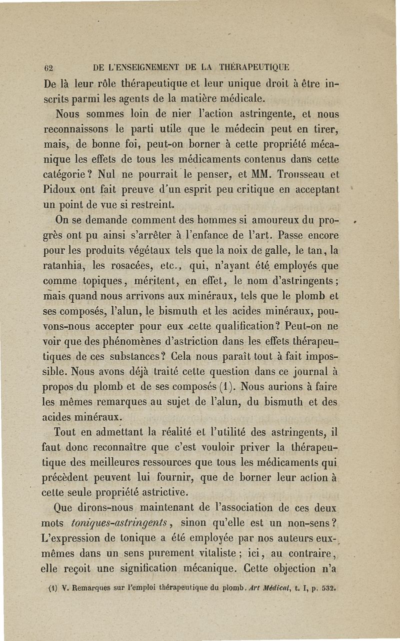 De l'enseignement de la thérapeutique à l'Ecole de Paris: examen du Traité de thérapeutique et de matière médicale de MM. Trousseau et Pidoux