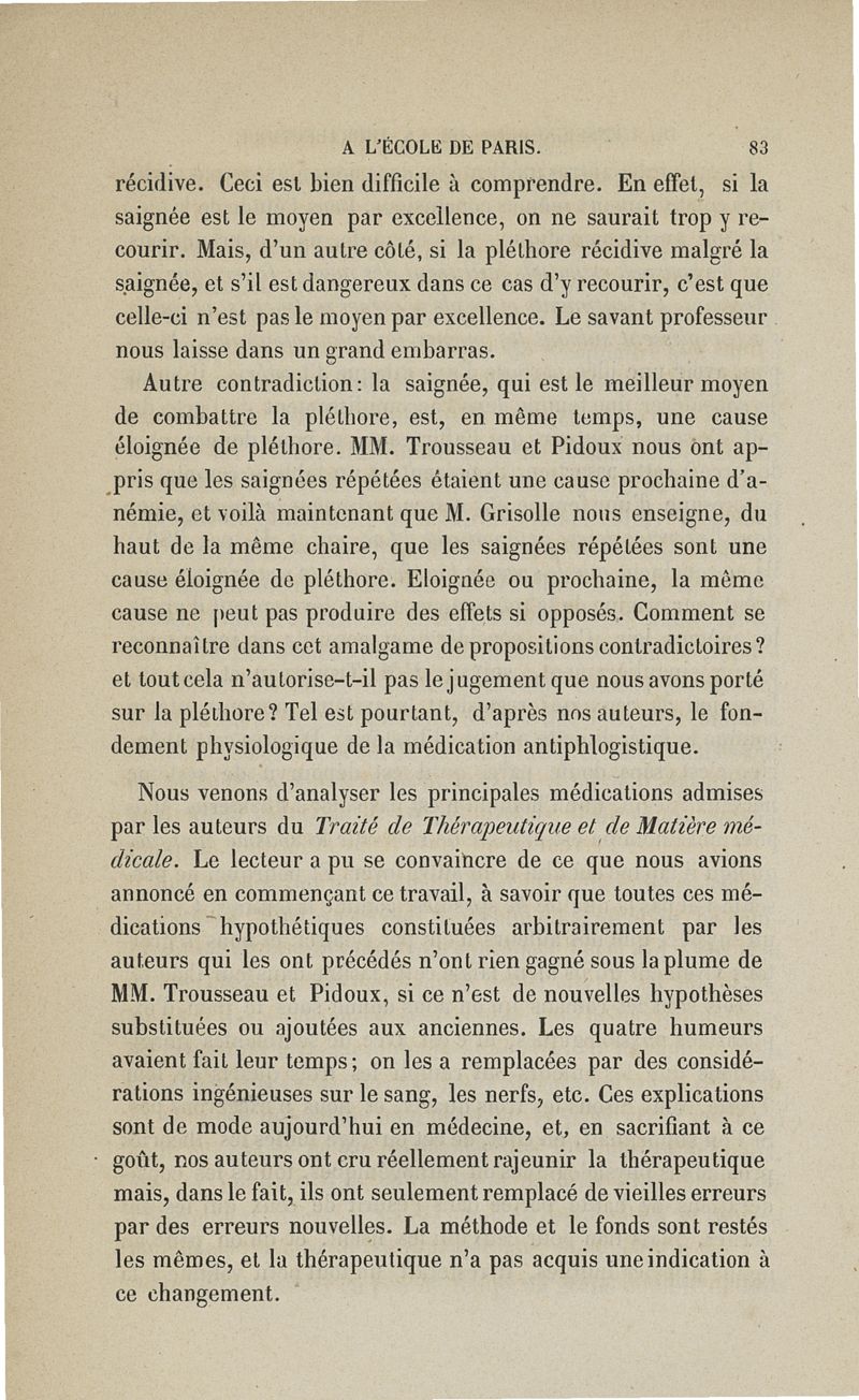 De l'enseignement de la thérapeutique à l'Ecole de Paris: examen du Traité de thérapeutique et de matière médicale de MM. Trousseau et Pidoux