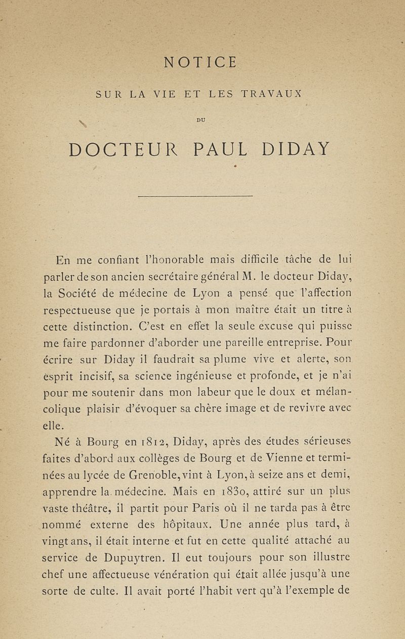 Notice sur la vie et les travaux du Dr Paul Diday, ancien chirurgien-major de l'Antiquaille (hôpital des vénériens de Lyon)