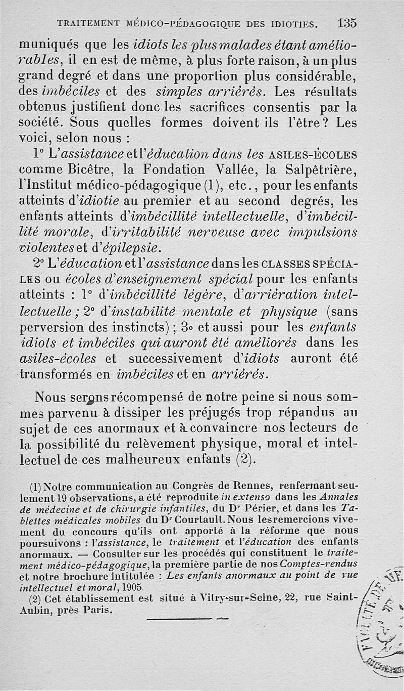 Traitement médico-pédagogique des différentes formes de l'idiotie