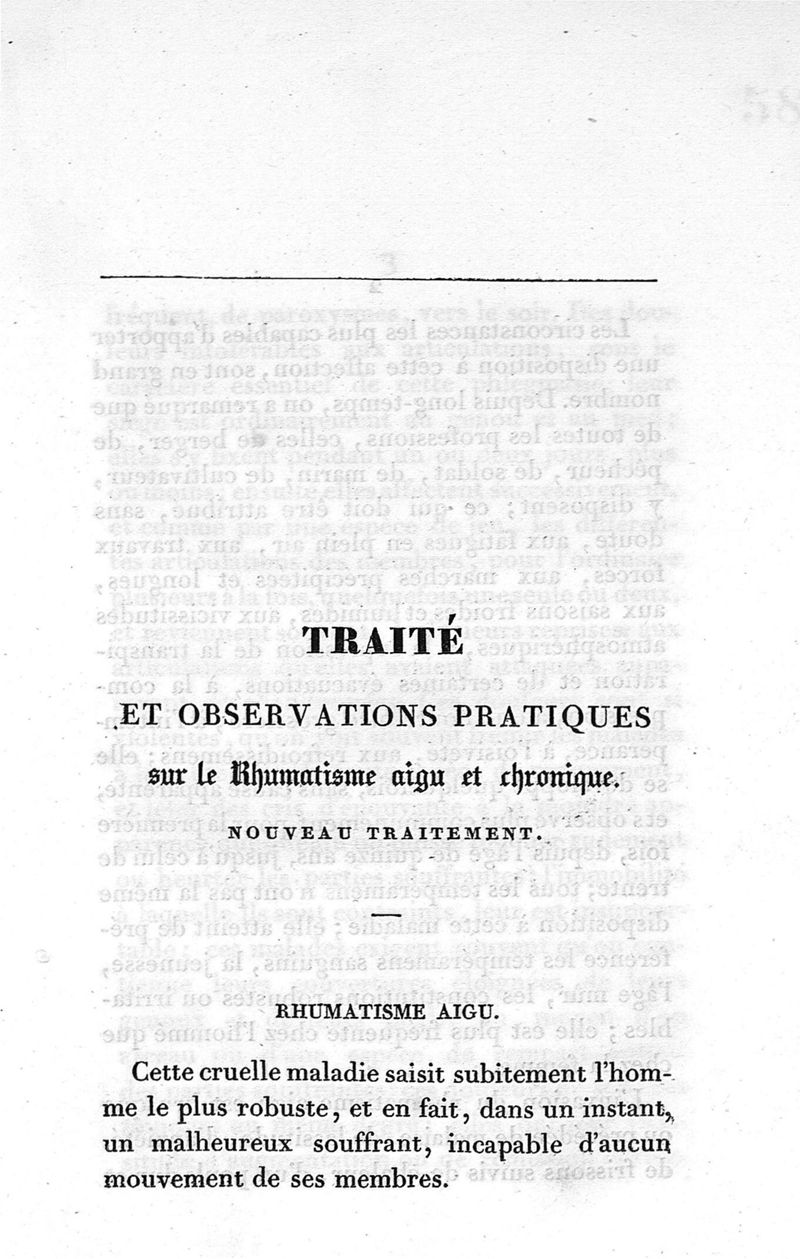 Traité et observations pratiques sur le rhumatisme aigu et chronique, nouveau traitement. Ouvrage utile aux médecins et aux personnes atteintes de douleurs rhumatismales