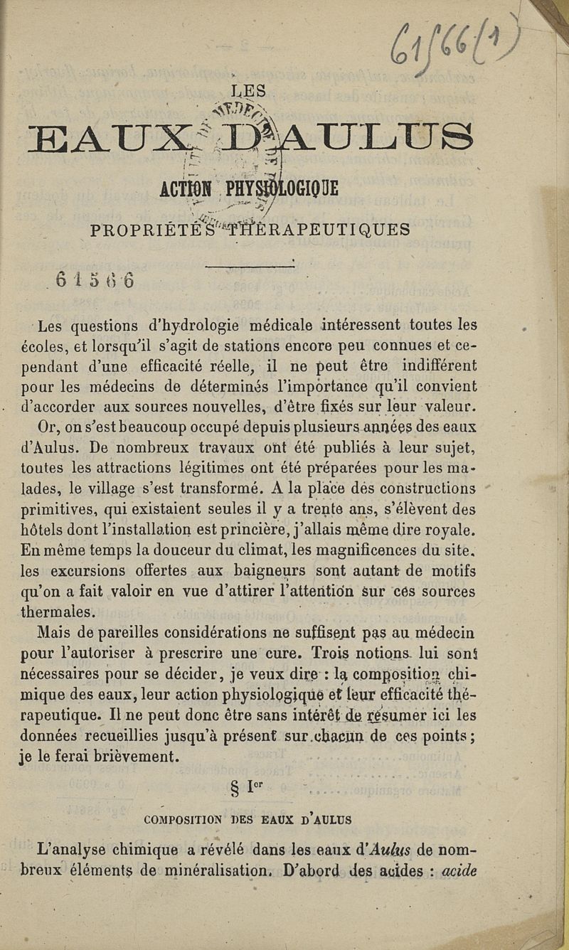 Les eaux d'Aulus. Actions physiologiques, propriétés thérapeutiques
