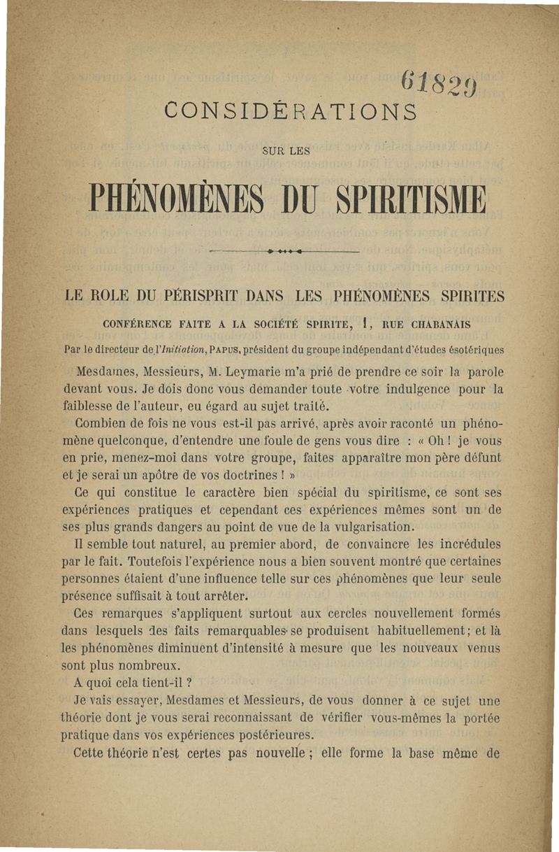 Considérations sur les phénomènes du spiritisme, rapports de l'hypnotisme et du spiritisme, nouvelles règles pratiques pour la formation des médiums, influence du périsprit dans la production des phénomènes spirites
