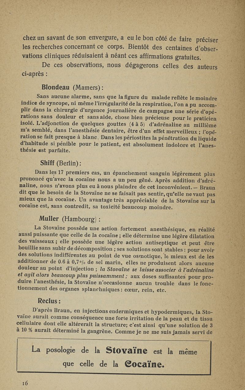 La stovaïne. Ses propriétés et ses emplois
