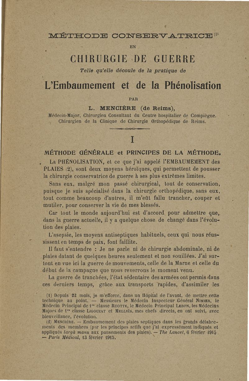 Méthode conservatrice en chirurgie de guerre telle qu'elle découle de la pratique de l'embaumement et de la phénolisation