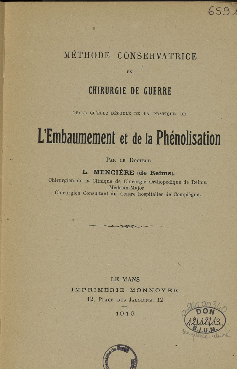 Méthode conservatrice en chirurgie de guerre telle qu'elle découle de la pratique de l'embaumement et de la phénolisation