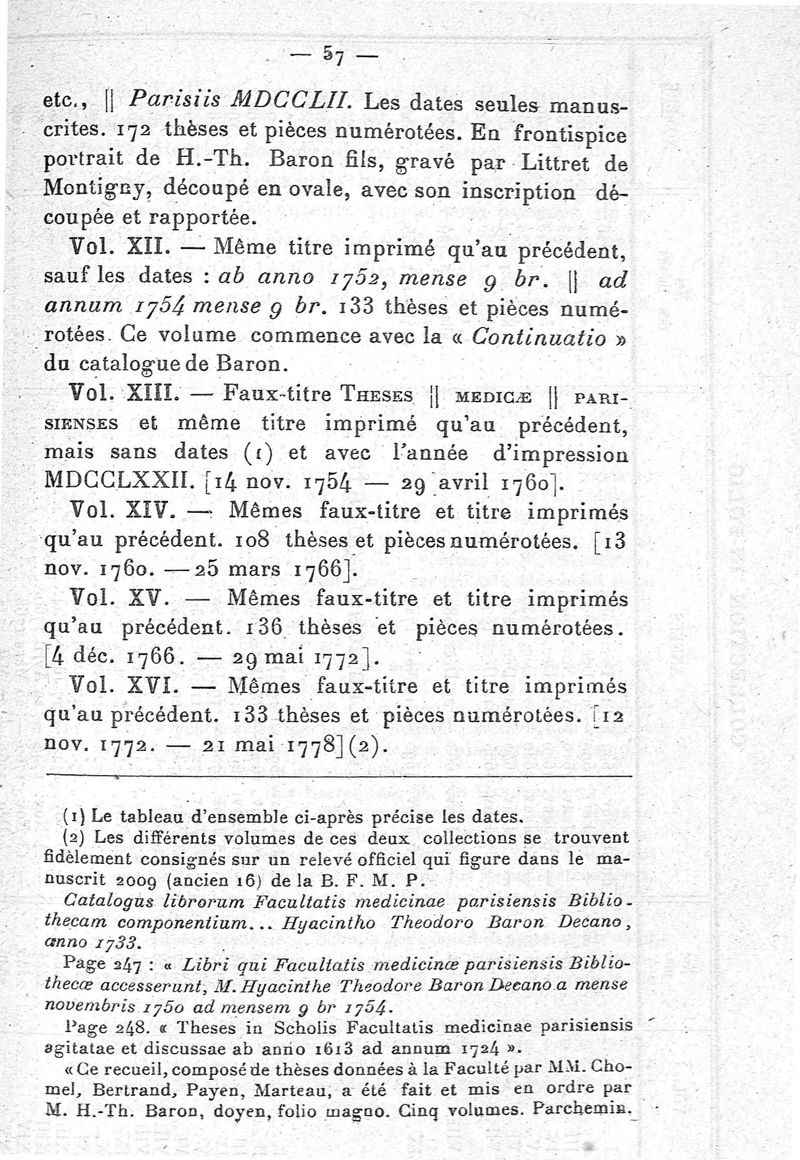 La collection des thèses de l'Ancienne faculté de médecine de Paris depuis 1539 et son catalogue inédit jusqu'en 1793. Documents sur l'histoire de la Faculté pendant la Révolution