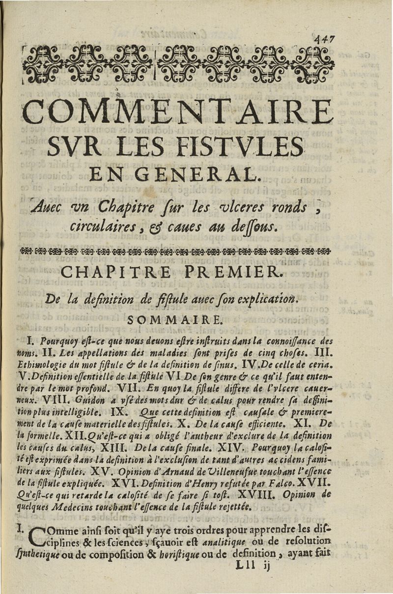 Les commentaires d'Antoine Lambert natif du LVC, me chirurgien à Marseille, divisez en cinq parties dont les matieres seront marquées à la page suivante