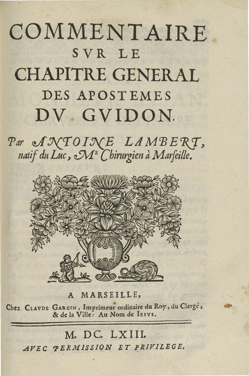 Les commentaires d'Antoine Lambert natif du LVC, me chirurgien à Marseille, divisez en cinq parties dont les matieres seront marquées à la page suivante